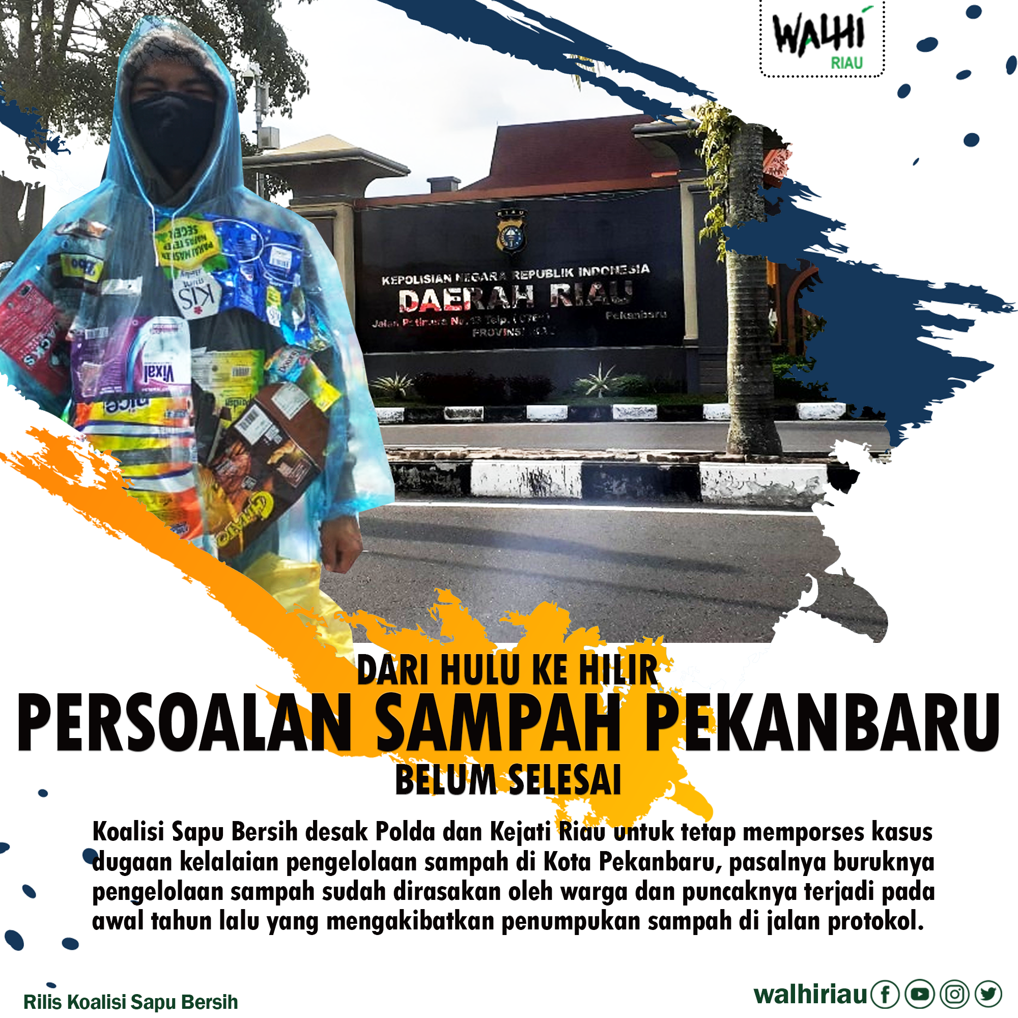 Pekanbaru, 25 Agustus 2021. Koalisi Sapu Bersih desak Polda dan Kejati Riau untuk tetap memporses kasus dugaan kelalaian pengelolaan sampah di Kota Pekanbaru, pasalnya buruknya pengelolaan sampah sudah dirasakan oleh warga dan puncaknya terjadi pada awal tahun lalu yang mengakibatkan penumpukan sampah di jalan protokol, “Sudah jelas pihak pemerintah dan pihak perusahaan yang pengangkut sampah tidak menjalankan aturan dalam perda No 8 Tahun 2014 tentang pengelolaan sampah, khususnya pemilahan sampah plastik sekali pakai,” kata Ahlul Fadli, Staf Advokasi, WALHI Riau.