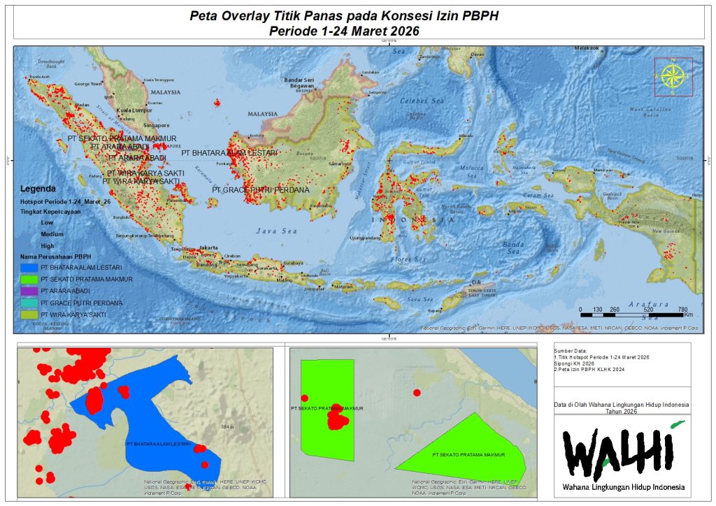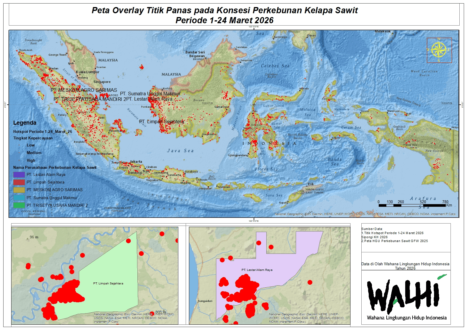 Pekanbaru, 2 April 2026– Wahana Lingkungan Hidup Indonesia (WALHI) menyoroti peningkatan signifikan kebakaran hutan dan lahan yang terjadi sepanjang hampir empat pekan pertama Maret 2026 di berbagai wilayah Indonesia. Titik panas (hotspot) teridentifikasi sebanyak 11.189 titik dengan tingkat kepercayaan tinggi, sedang dan rendah. Sebanyak 1.351 titik berada di dalam konsesi dan sekitar konsesi 15 perusahaan. Dengan rincian 699 titik api di dalam dan sekitar konsesi 5 perusahaan sawit; 285 titik api di dalam dan sekitar konsesi 5 perusahaan PBPH; dan 367 titik api di dalam dan sekitar konsesi 5 perusahaan tambang.