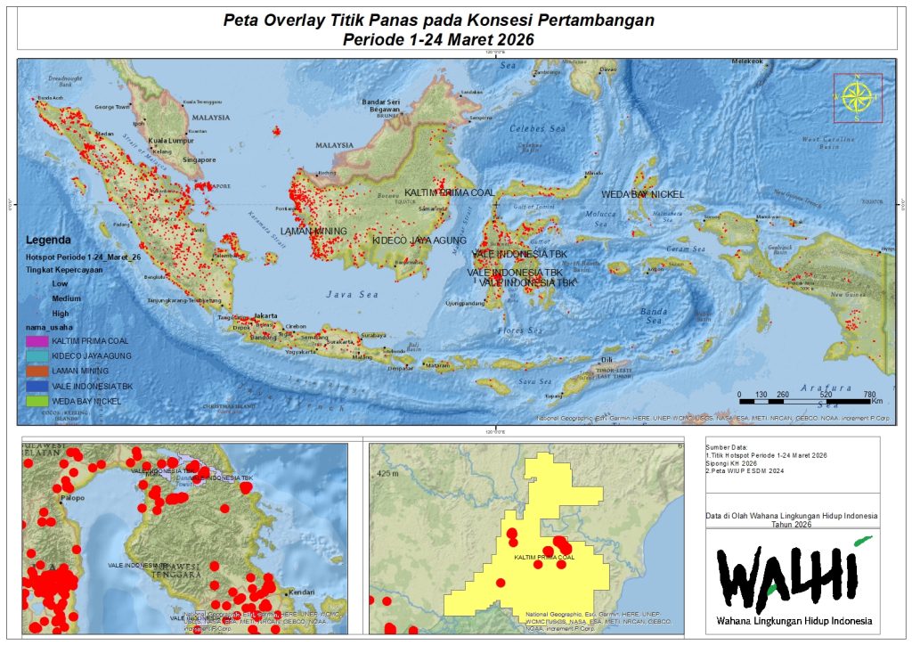 Kalimantan Barat menunjukkan pola yang sama, dengan sebaran luas di wilayah perkebunan skala besar dan hutan produksi. Awal Tahun 2026 Kalimantan Barat mengalami kebakaran hutan dan lahan yang begitu dahsyat yang mengakibatkan buruknya kualitas udara yang berdampak bagi kesehatan. Lebih buruknya, dampak karhutla bahkan menyebabkan satu orang mengalami kematian di Desa Galang Mempawah Kalimantan Barat. Analisa spasial WALHI Kalimantan Barat menggunakan satelit Terra/Aqua menemukan sebanyak 679 titik hotspot sepanjang Januari-Maret dengan tingkat kepercayaan tinggi dan sedang yang tersebar diluar dan didalam konsesi. Kondisi ini mengindikasikan bahwa adanya kerusakan terhadap tata kelola lahan di Kalimantan Barat yang dipicu oleh praktik pengelolaan lahan dan kerusakan ekosistem yang telah berlangsung lama.